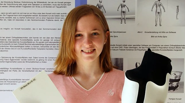Anika Spira (20) forscht und arbeitet gemeinsam mit Fachfirmen an der Entwicklung eines wärmeleitfähigen Skoliose-Korsetts zur Linderung von Schmerzen bei Wirbelsäulenverkrümmung, die durch einen oft unerträglichen Hitzestau entstehen.
